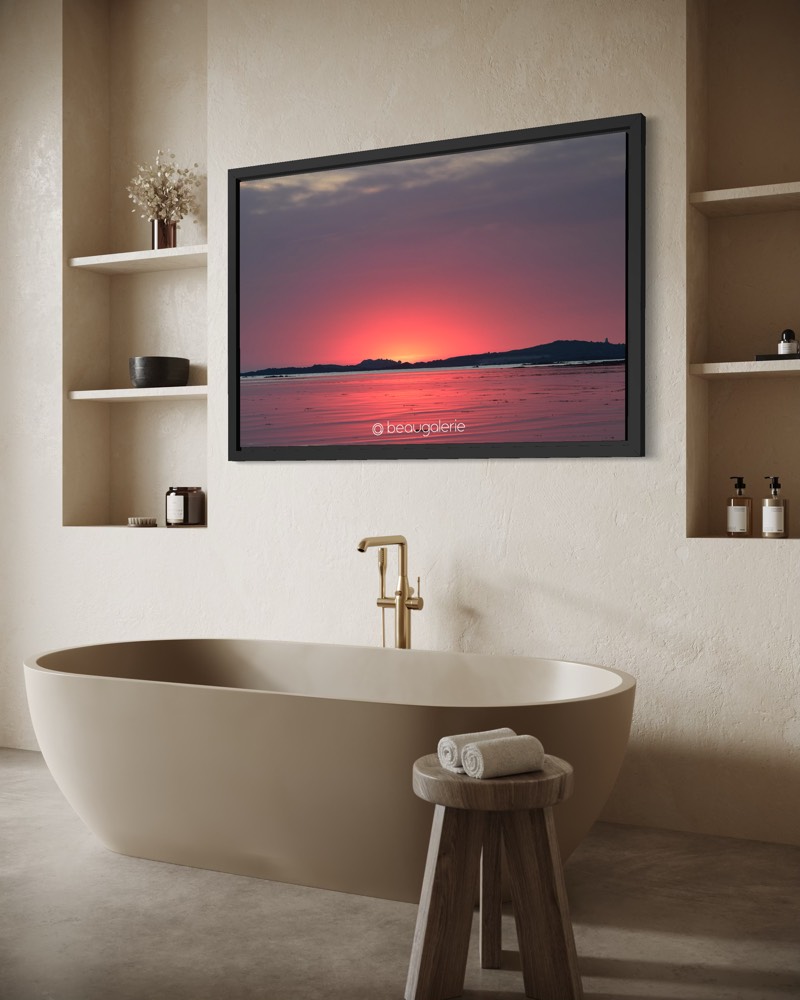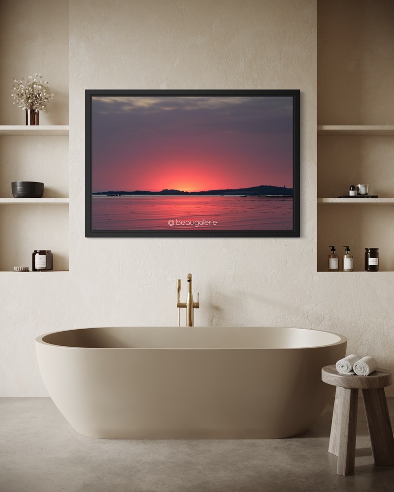 Ce ciel rose sur l’île Callot se dévoile dans un instant suspendu, lorsque l’aube colore l’horizon bien avant le lever du soleil, offrant à la mer une lumière douce et irréelle.