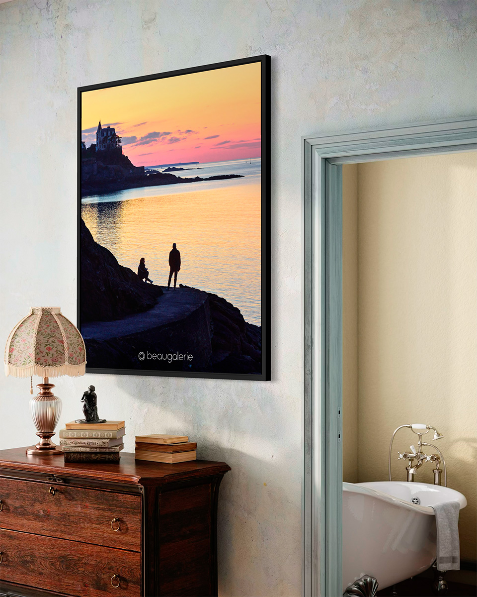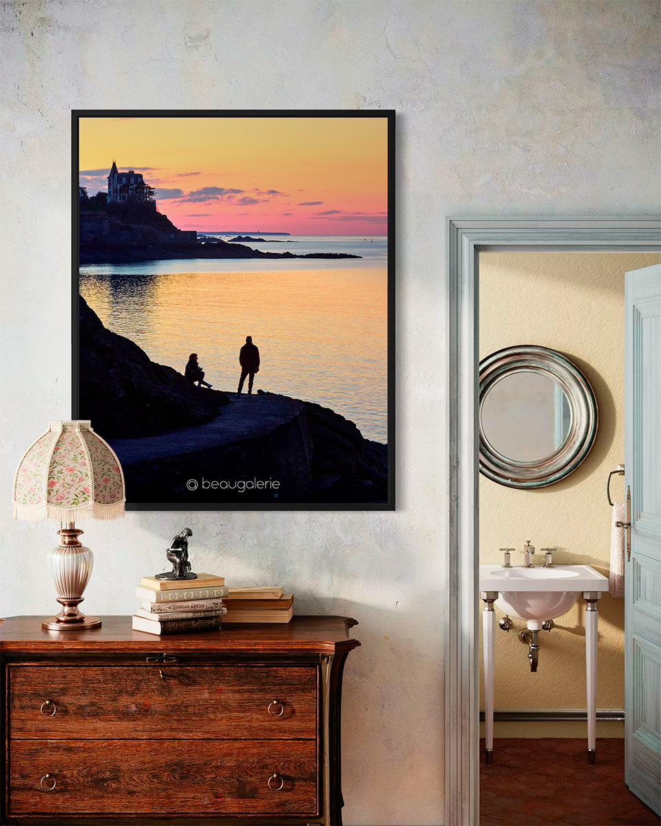 Tirage d’art de Dinard au coucher du soleil, célébrant la beauté du contre-jour sur la pointe du Moulinet, signé Philippe Meunier Photographe.