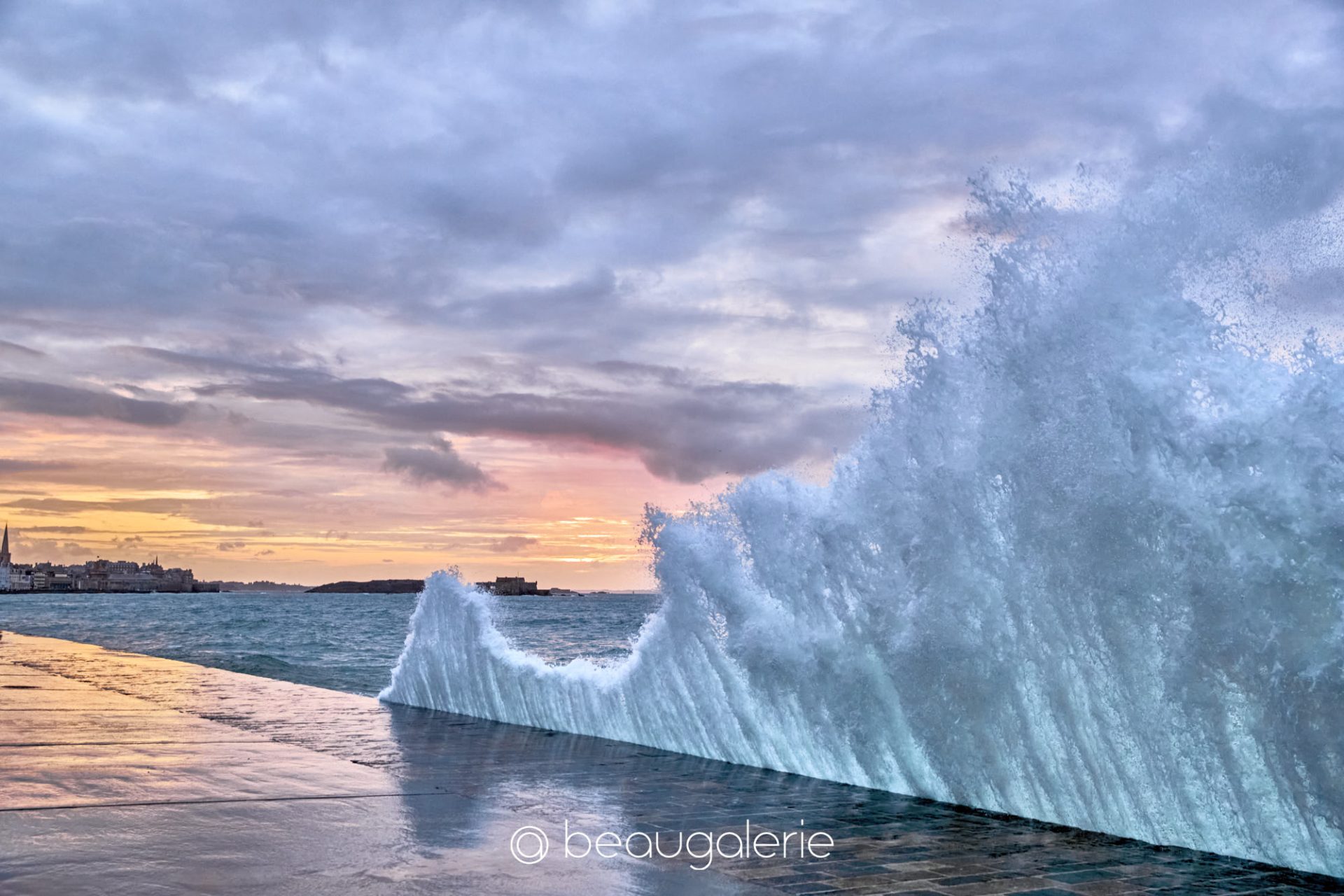 Cette scène de grande marée et mur d’eau malouin au soleil couchant révèle l’instant où la mer se dresse contre le Sillon dans une forme presque sculptée par le vent et la lumière. La cité corsaire apparaît au loin, paisible, comme si le soir retenait un souffle pour laisser la mer raconter son histoire. Le regard suit l’onde, puis la couleur du ciel, puis la douceur du moment, et tout semble tenir dans ce dialogue simple et vibrant. Philippe Meunier Photographe