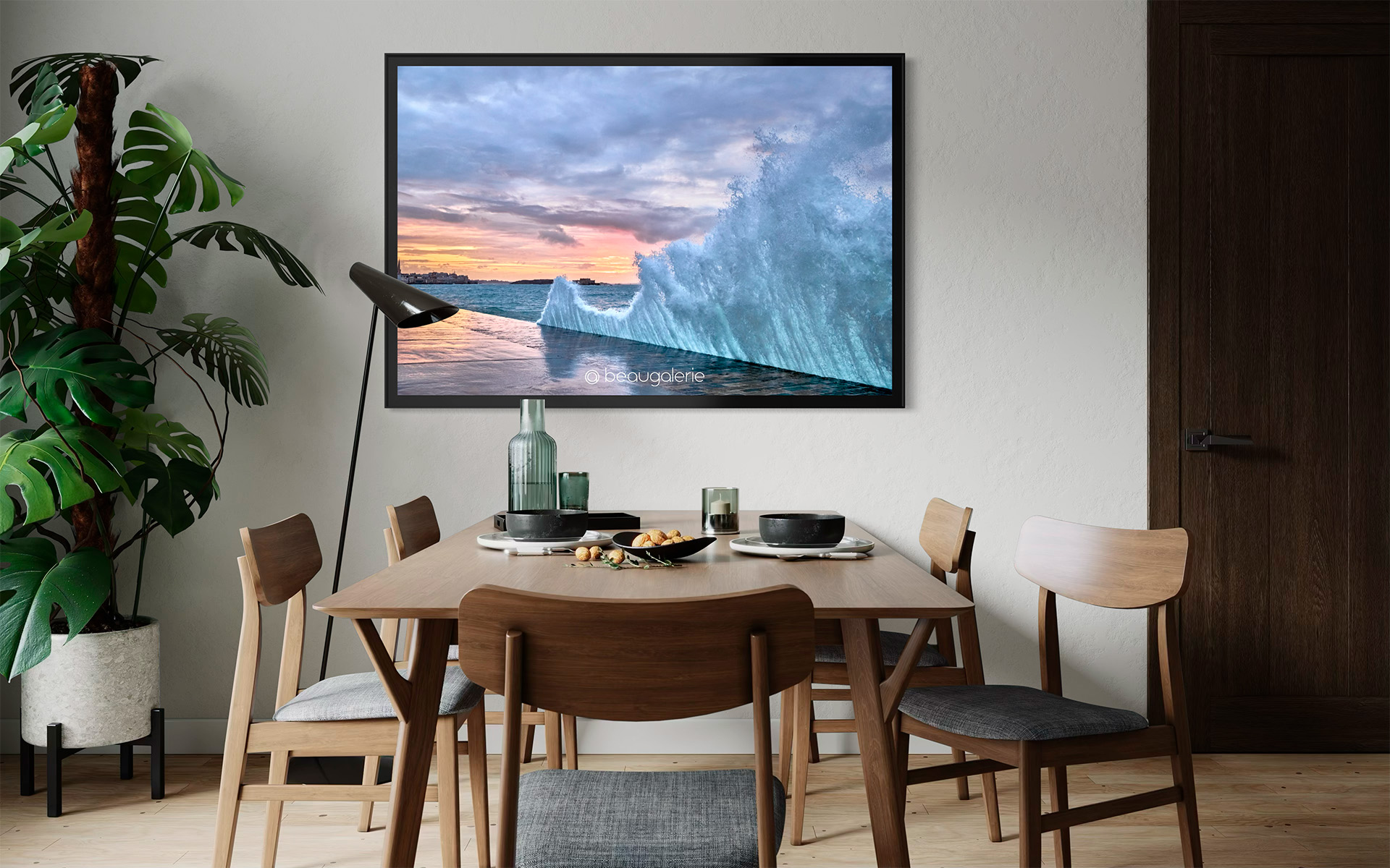 Proposé en tirage d’art sur papier de qualité muséale, ce visuel restitue la texture de l’écume, la transparence de la lumière et la force de la vague avec une précision fidèle. Chaque tirage met en valeur la richesse des tons du ciel et la profondeur de la mer, créant une présence visuelle apaisante et immersive.